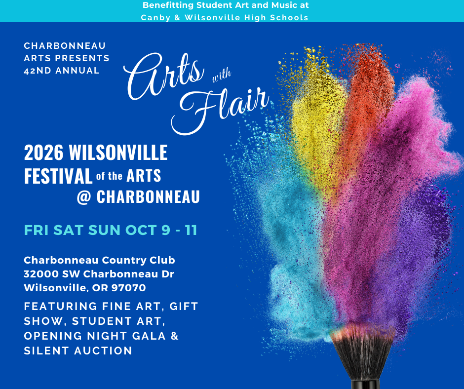 Join us October 10-12, 2025, in the Village of Charbonneau in Wilsonville, Oregon, just south of the Willamette River, for “Arts with Flair,” the Wilsonville Festival of the Arts @ Charbonneau. The event includes a Fine Art Gallery, Artist and Artisan Booths, a Student Art Gallery with student artwork from area high schools, and our always popular Silent Auction fundraiser.