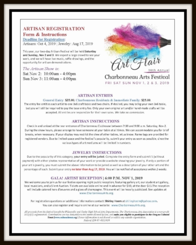 Check in and unload at the rear entrance of Charbonneau Clubhouse between 7:30am and 9:00am. Saturday, Nov 2. During the show hours, please arrange to have someone at your table at all times. We can accommodate you for brief breaks, when necessary. If your display may restrict the view of other tables, let us know. Name tags are provided for registered vendors. Due to limited space and the festival’s popularity, submit your entry as soon as possible, since the various types of art mediums will be limited in numbers. Soap and fragrance vendors will be specifically limited to no more than 2. Updated 6/15/19: We are now closed for soap and fragrance vendors.